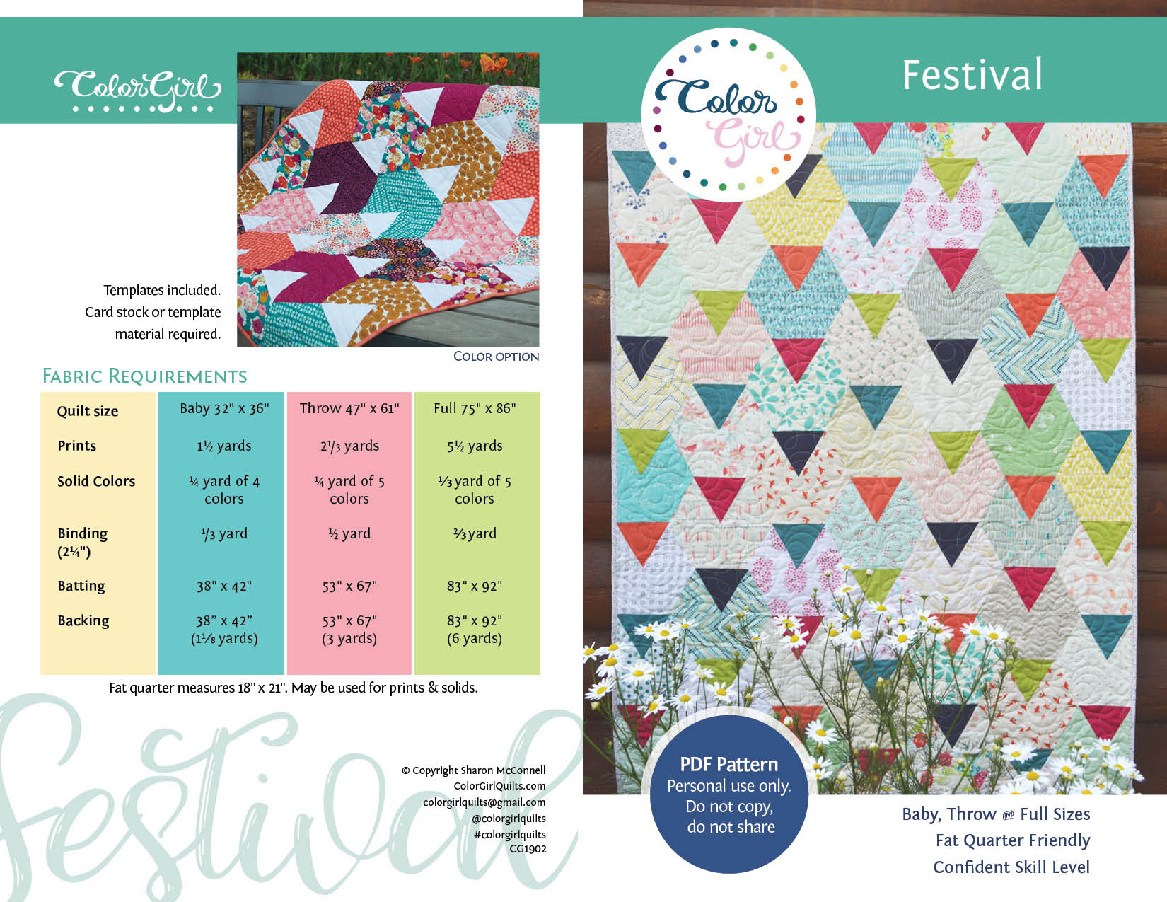 The Festival pattern includes three sizes: baby, throw and full. Pattern includes full size templates and full color, illustrated instructions.