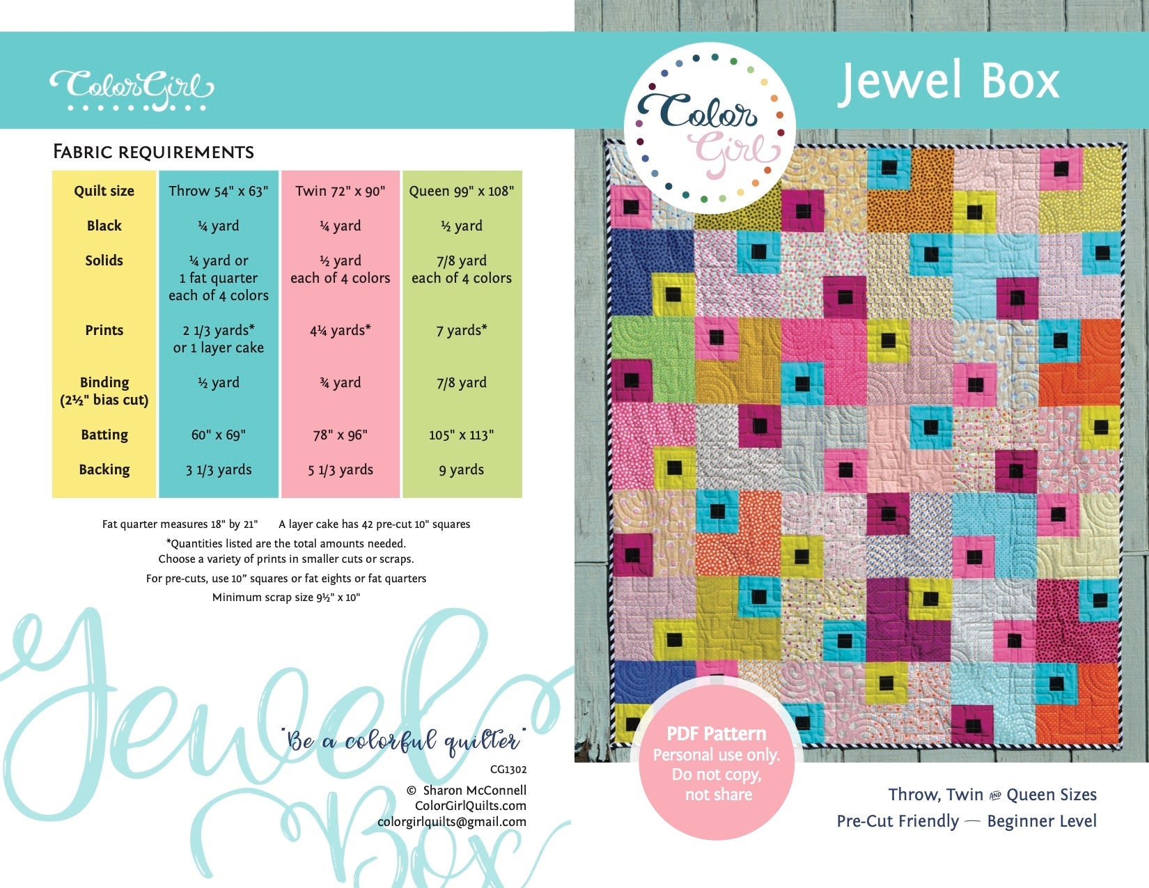 Pattern is ideal for pre-cut 10" squares, fat quarters or scraps. Sizes can be easily adapted by adding borders or changing the number of blocks.